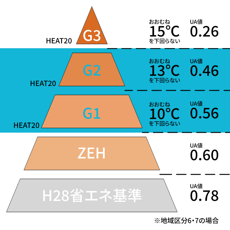2016年に義務化された最低基準。基準を満たせば従来の住宅より快適ですが、最新の断熱水準と比べると性能は限定的です。