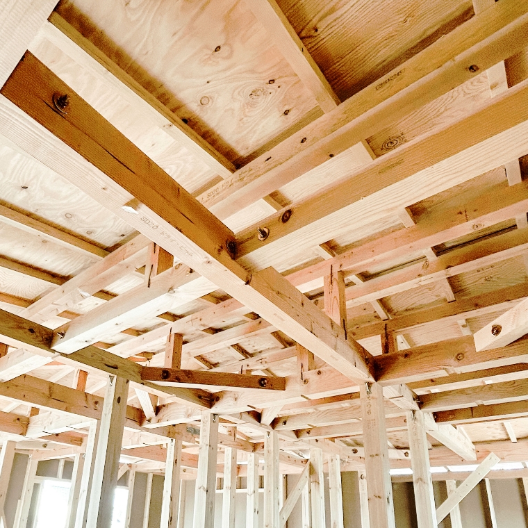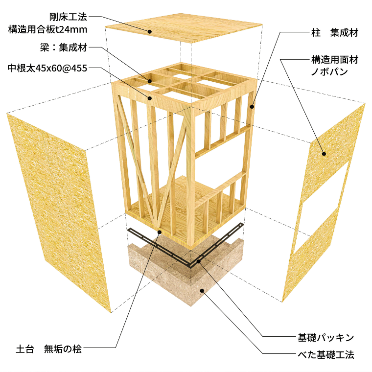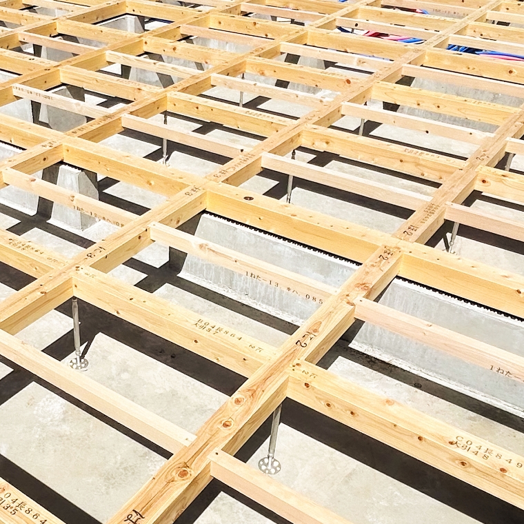 床の強度と快適性を両立するために「剛床工法」に「中根太」を組み合わせています。剛床工法は、24mmの構造用合板を床下地組の上に直接張り、床全体を一体化させる工法で、高い耐震性と床剛性を実現します。通常は910mm×910mmのピッチで梁を構成しますが、当社ではさらに455mm間隔で45x60の中根太を加えることで、床のたわみや振動を抑制。日常生活の荷重や地震時の水平力にも強く、長期にわたって安定した床性能を維持します。これにより、2階リビングや大空間の間取りでも、しっかりとした安心感のある住まいをお届けします。