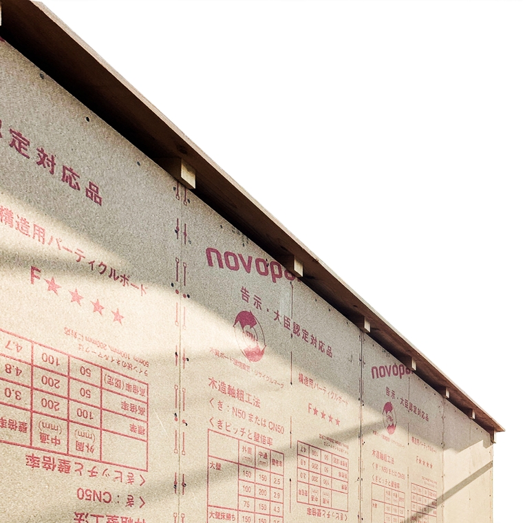 ノボパンは、構造用パーティクルボードとして高いせん断性能と釘接合力を備え、壁や床を強固に一体化させることで地震時の変形を抑える優れた耐震性を発揮します。材質が均一で方向性が少なく、どの方向から荷重を受けても安定した強度を保つため、耐力壁の配置や間取り設計の自由度も高まります。さらに大判サイズにより継ぎ目が減り、施工精度と剛性を向上。遮音性・断熱性にも優れ、住まいの快適性にも寄与します。再生木材を活用した環境配慮型の材料であり、安定供給が可能な点も大きな強みです。