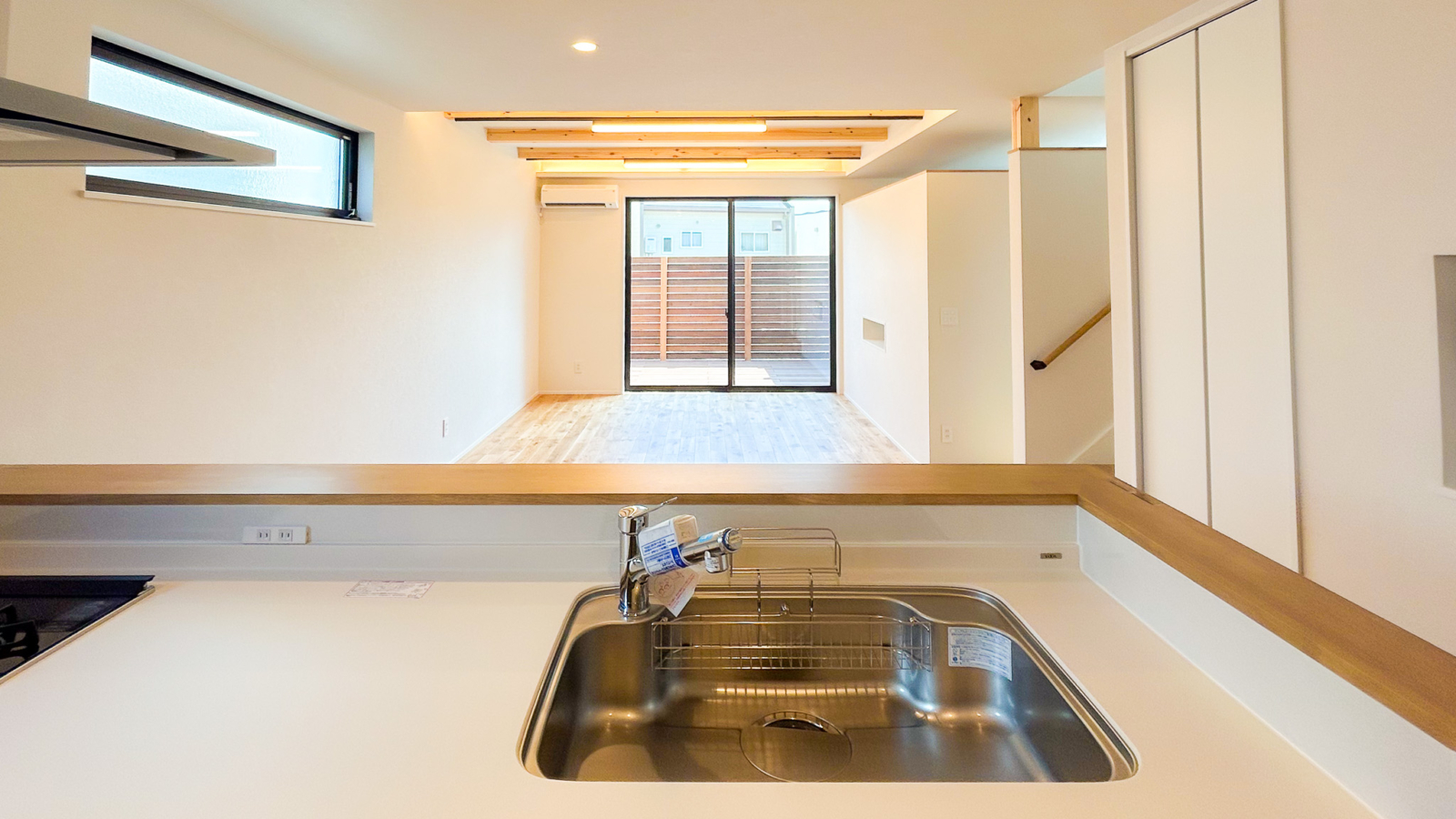 キッチンからウッドデッキへと視線が抜けるように計画した住まいです。