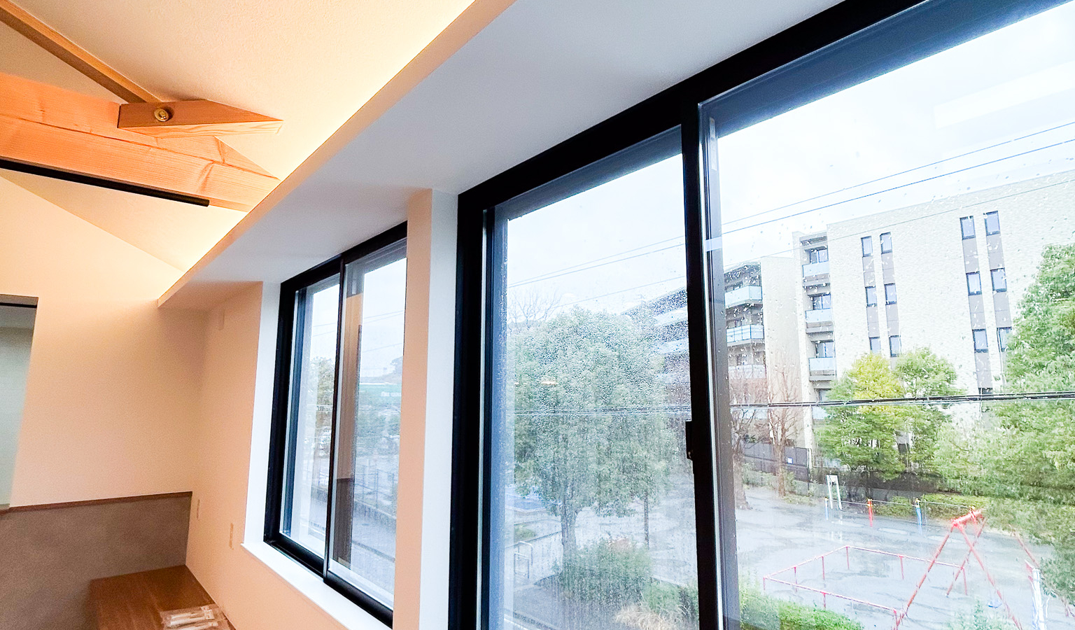 天井の高まりとともに、上部には2段の開口を設け、南側の隣地建物をかわしながら、空へと抜ける視線とともに風の通り道を確保しています。
