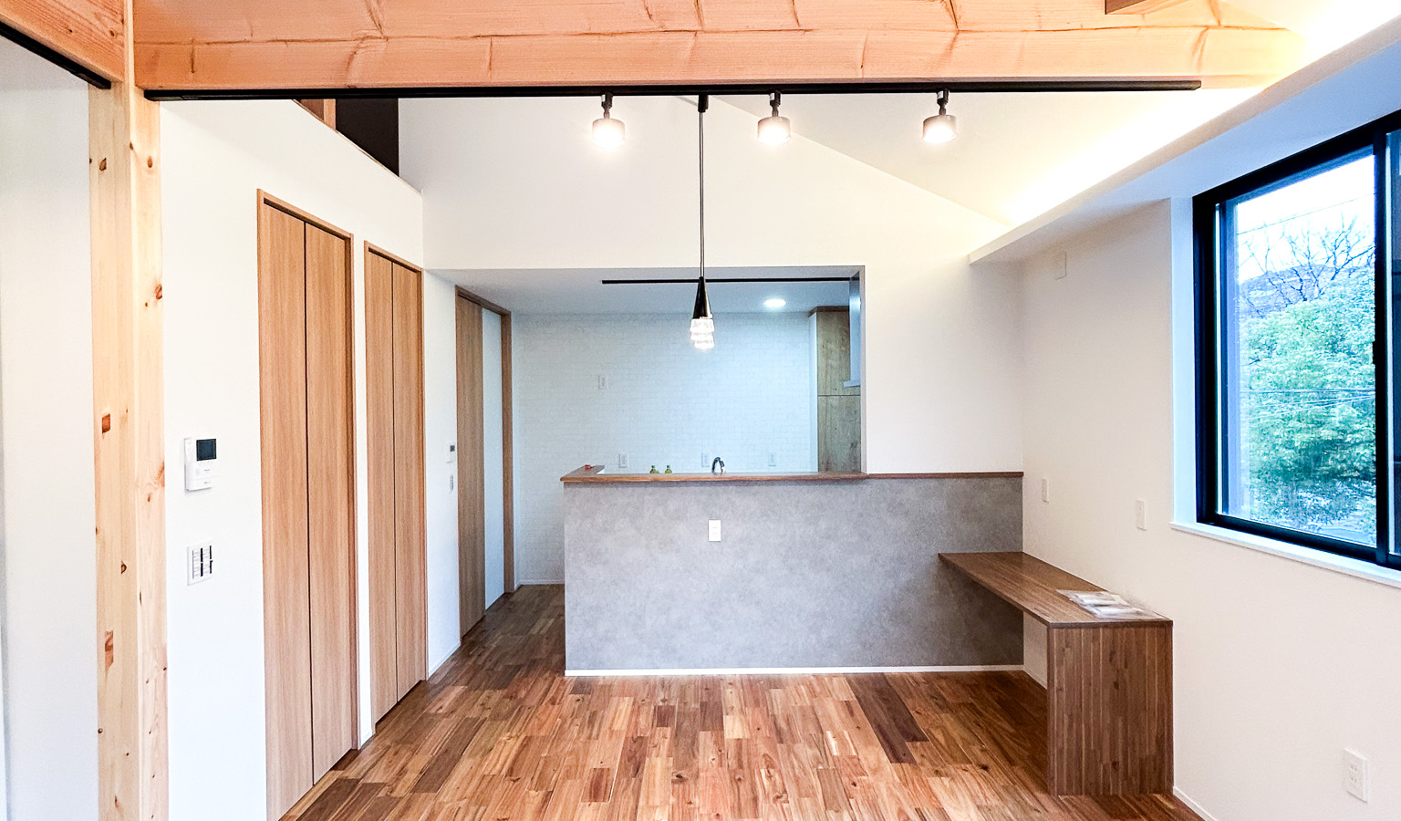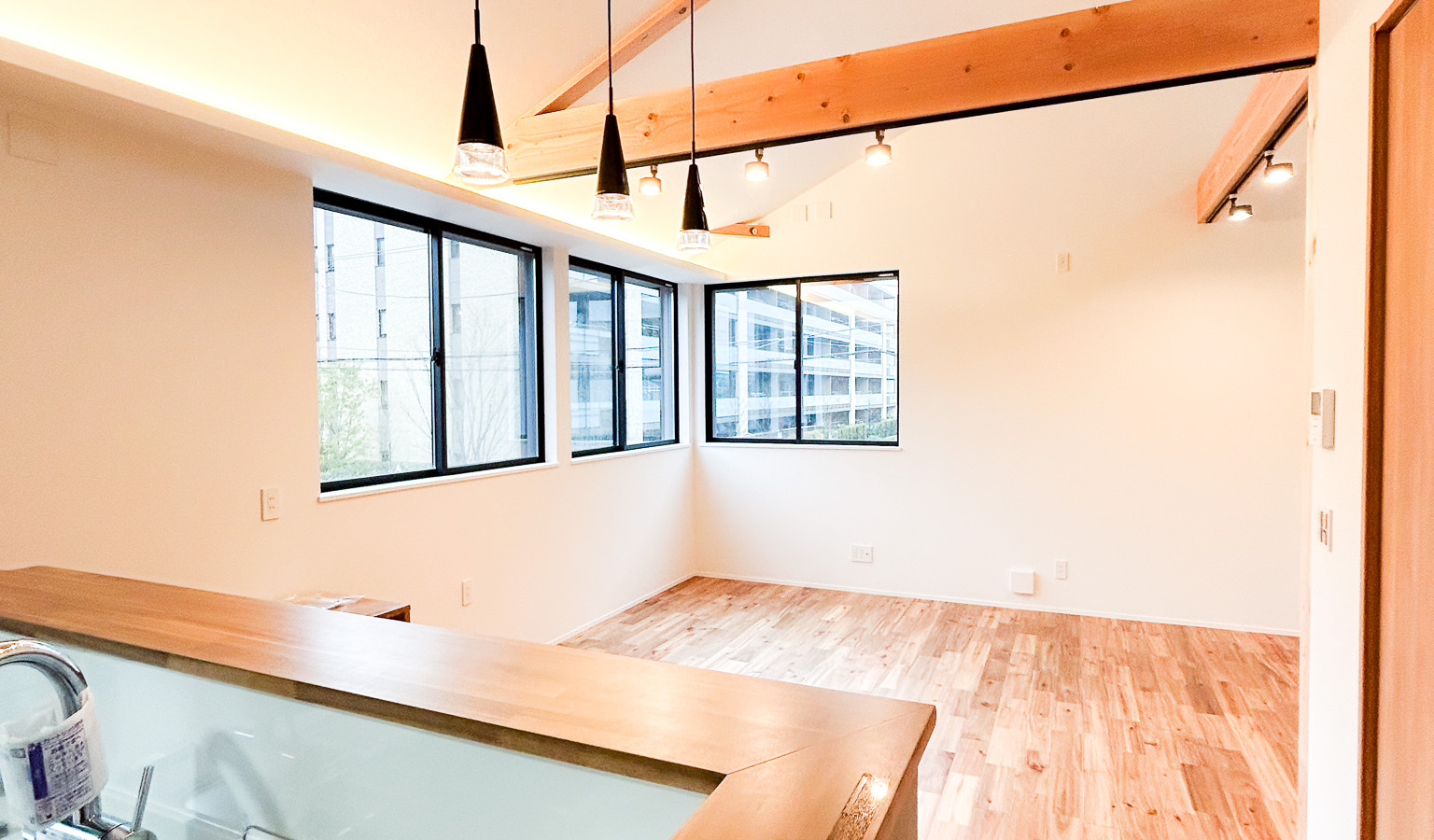 斜天井の下、家族が集うリビングは、木の梁や木壁の表情が心地よく、自然のやさしさと木造空間の力強さがほどよく融合しています。