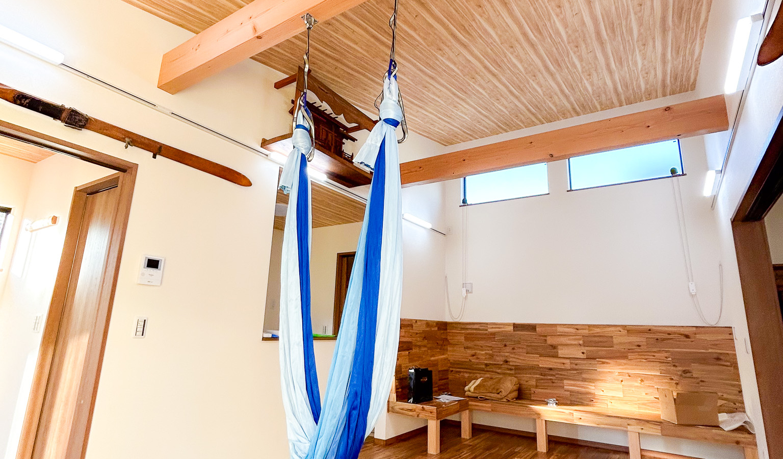 ゆらりと揺れるハンモックが、木の梁や天井高のあるリビングに軽やかな動きを添え、家族の楽しめる場が生まれます。