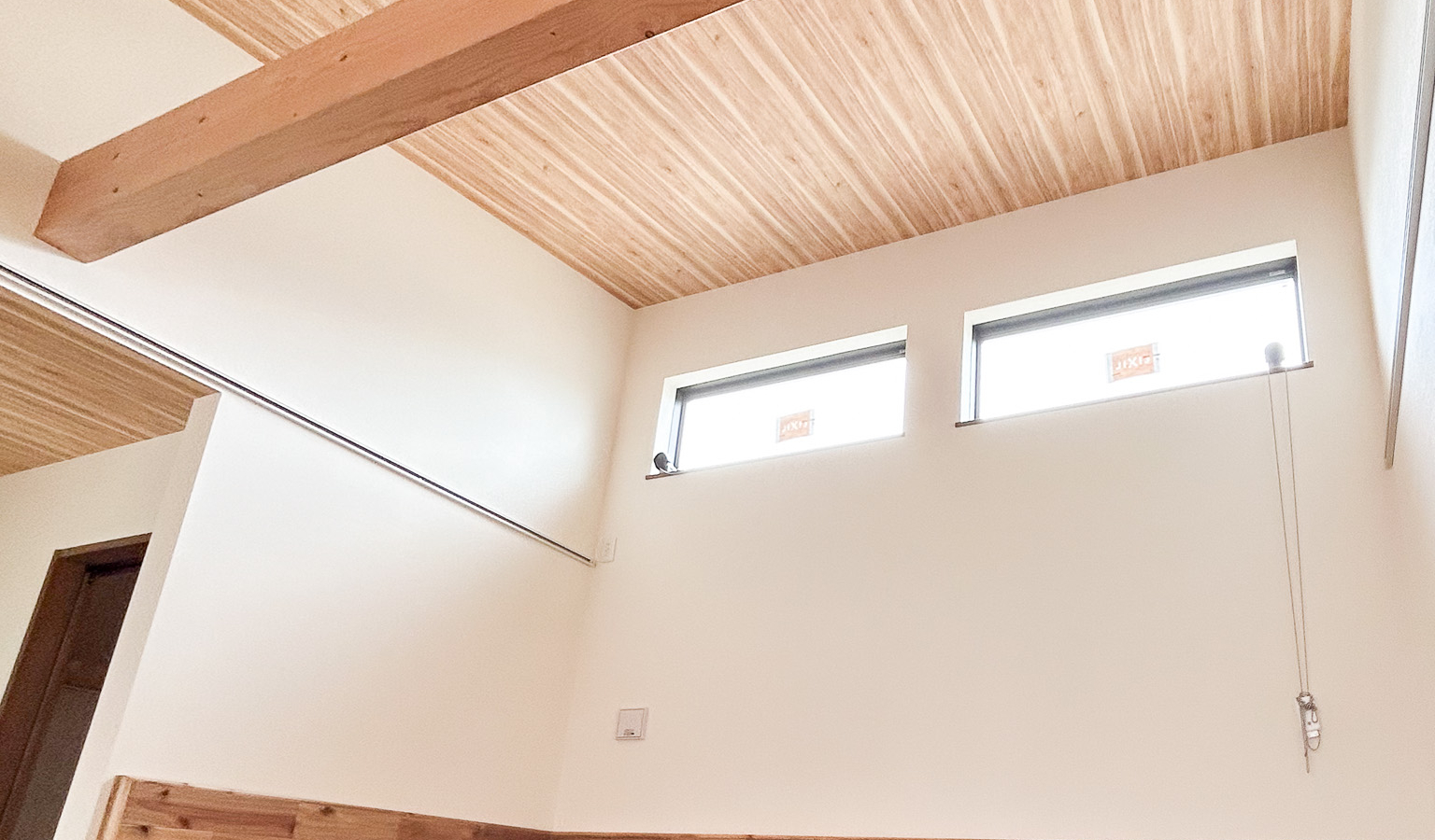 リビングは斜めに持ち上げた天井を採用し、その天井の中で梁を現しとしました。