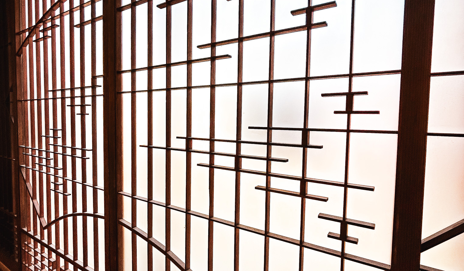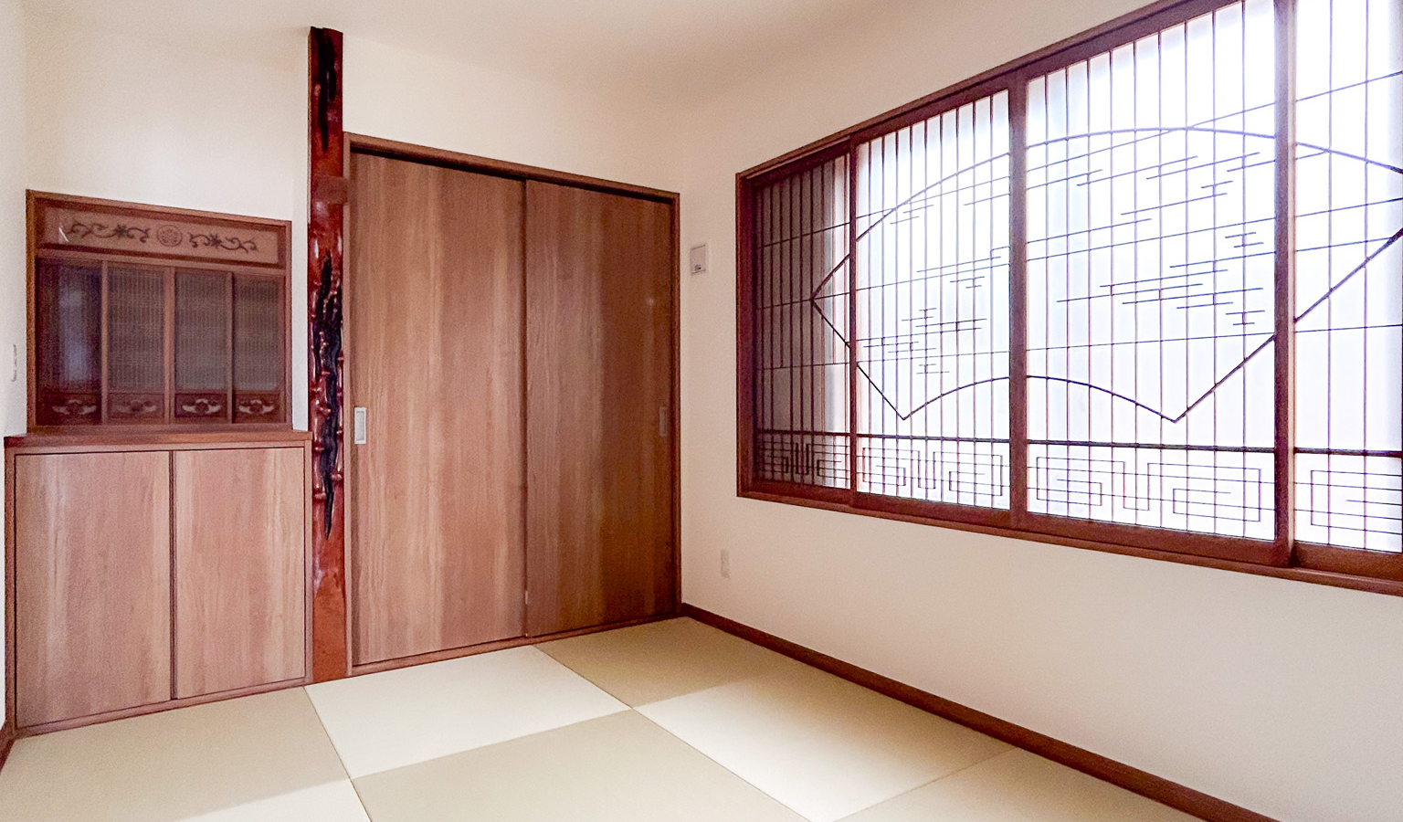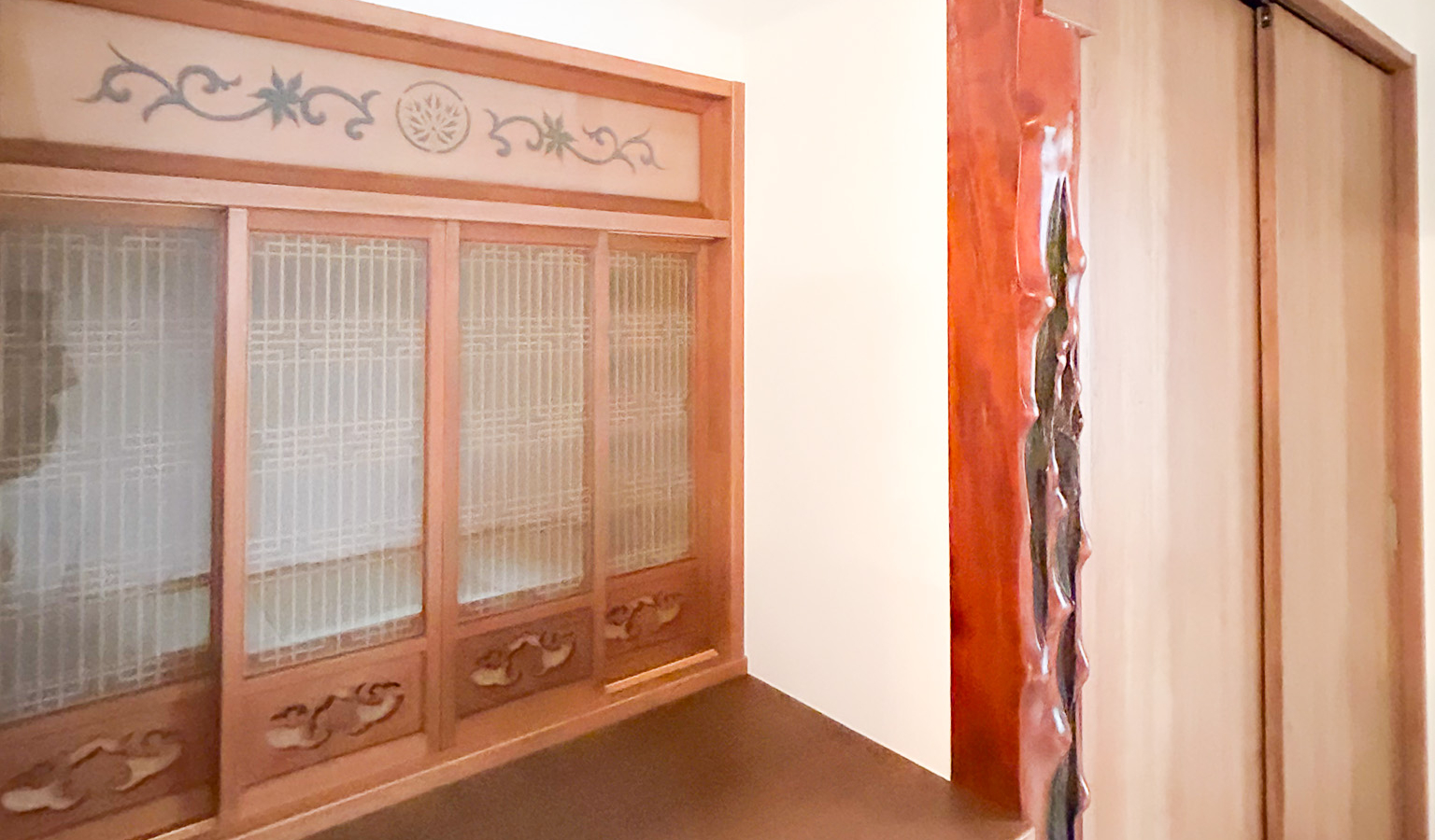 床柱、お仏壇の4枚戸、そして扇状のデザインが配された障子──